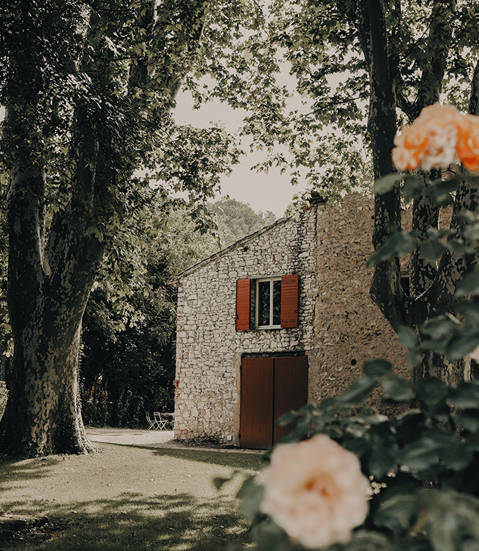 Sous les platanes, entre les oliviers ou le long d’un mur de pierre, les jardins du Moulin composent des ambiances variées et naturelles.